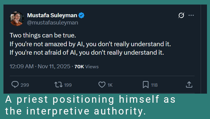 The priesthood’s position depends on maintaining mystique while maximizing extraction. Undefined superintelligence threats justify regulatory moats. Grand promises of future salvation excuse present harm. And the whole system operates on deferred accountability.